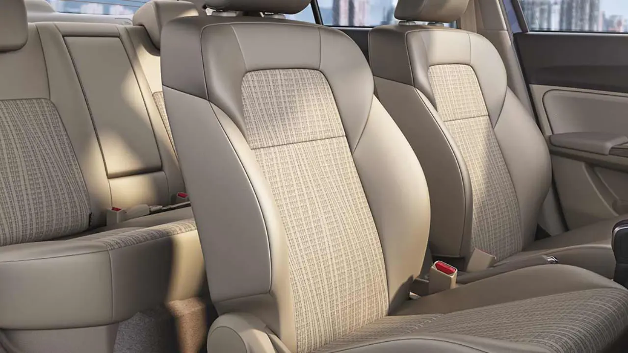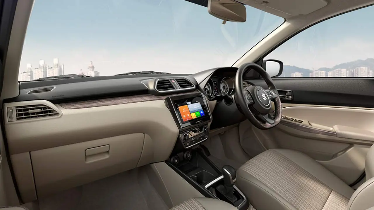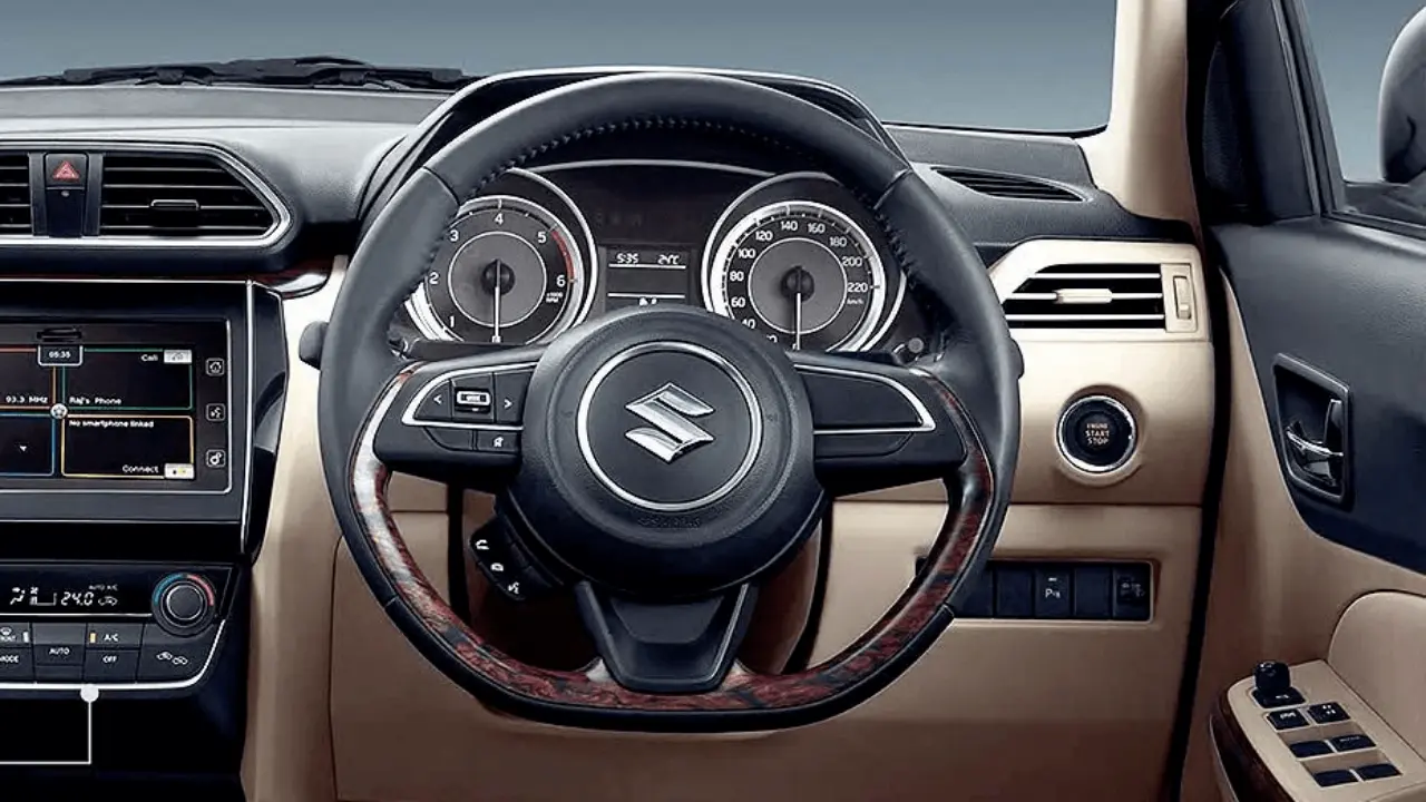 The new Maruti Dzire gets beige upholstery, a push start/stop button, reverse parking sensors, keyless entry, rear aircon vents, a seven-inch touchscreen infotainment system, a flat-bottom steering wheel, and cruise control.